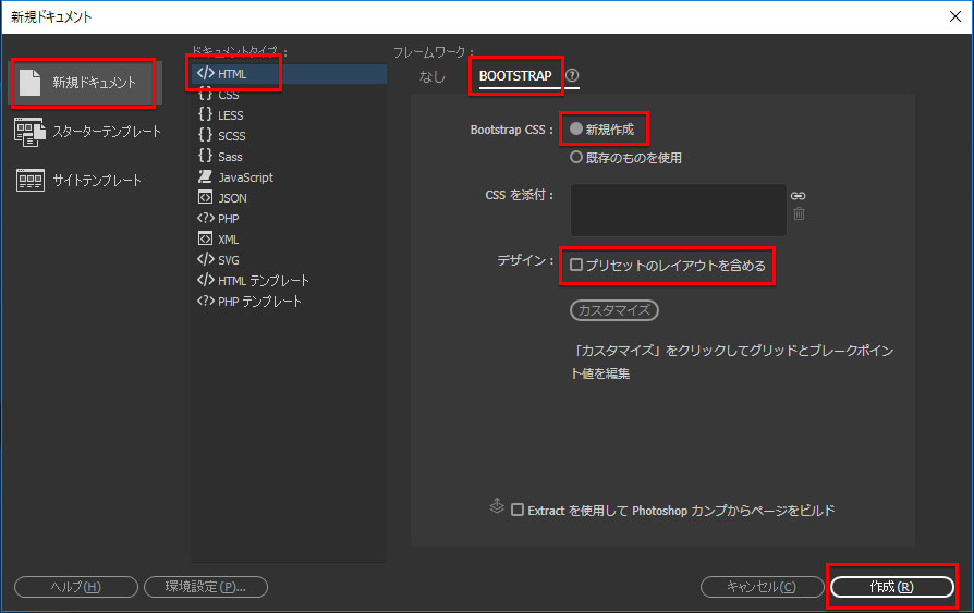 「新規ドキュメント」→「</>HTML」→「BOOTSTRAP」→「新規作成」をクリックします。