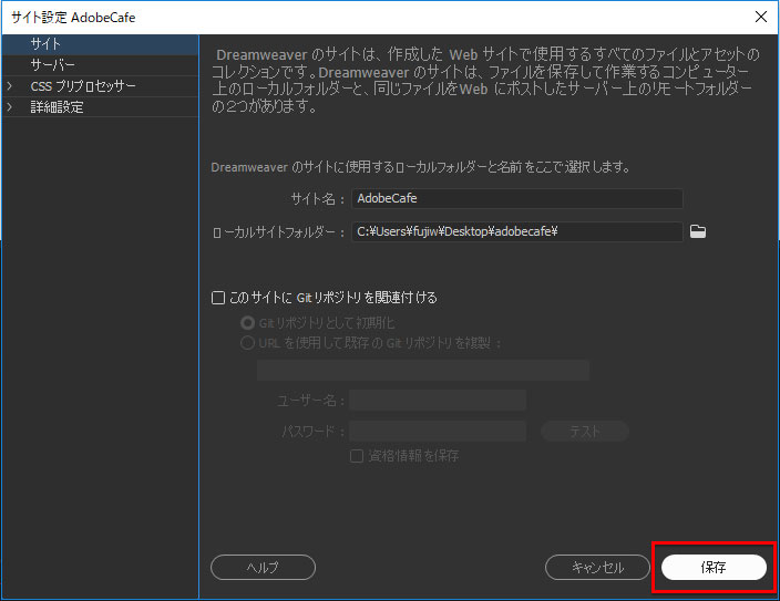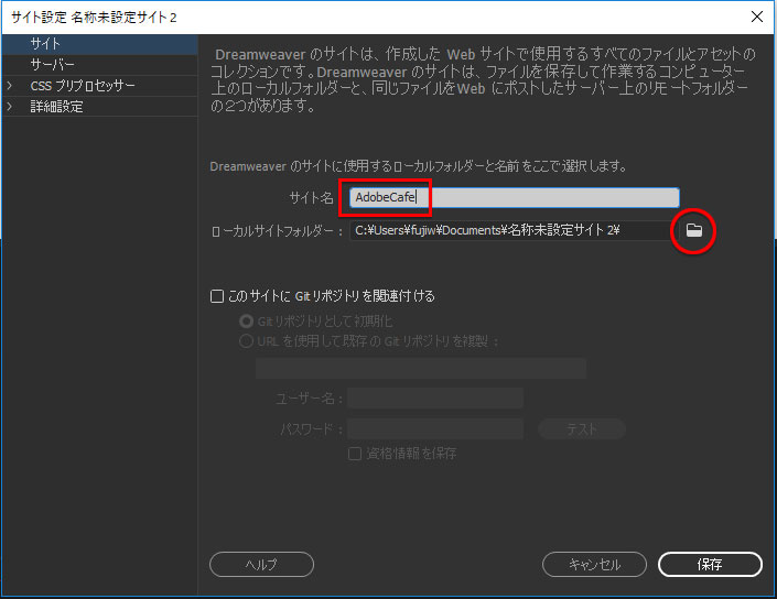サイト設定の画面が開きますので、サイト名に「AdobeCafe」と入力し、ローカルサイトフォルダーを参照します。