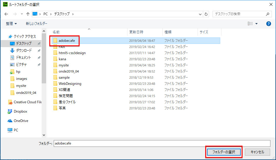 ルートフォルダ選択画面で、「adobecafe」フォルダを選択し、「フォルダーの選択」ボタンをクリックします。