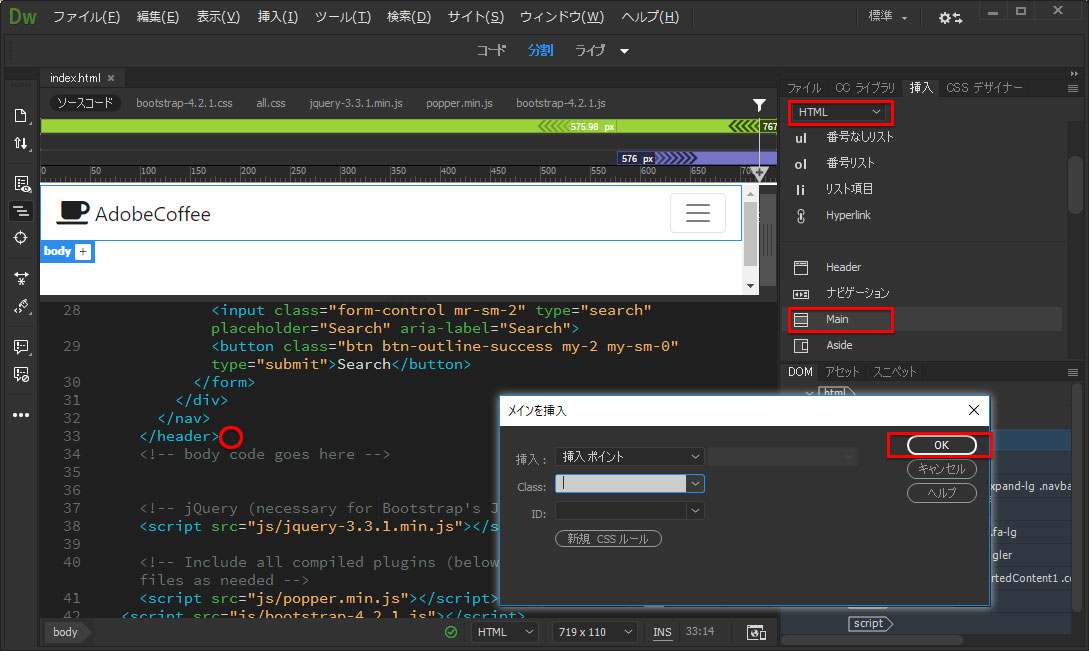 パネルの切り替えが面倒であれば、<main></main>をタイプしても構いません。Dreamwaverにはコードヒントが搭載されていますので、こちらの方が簡単かも知れません。