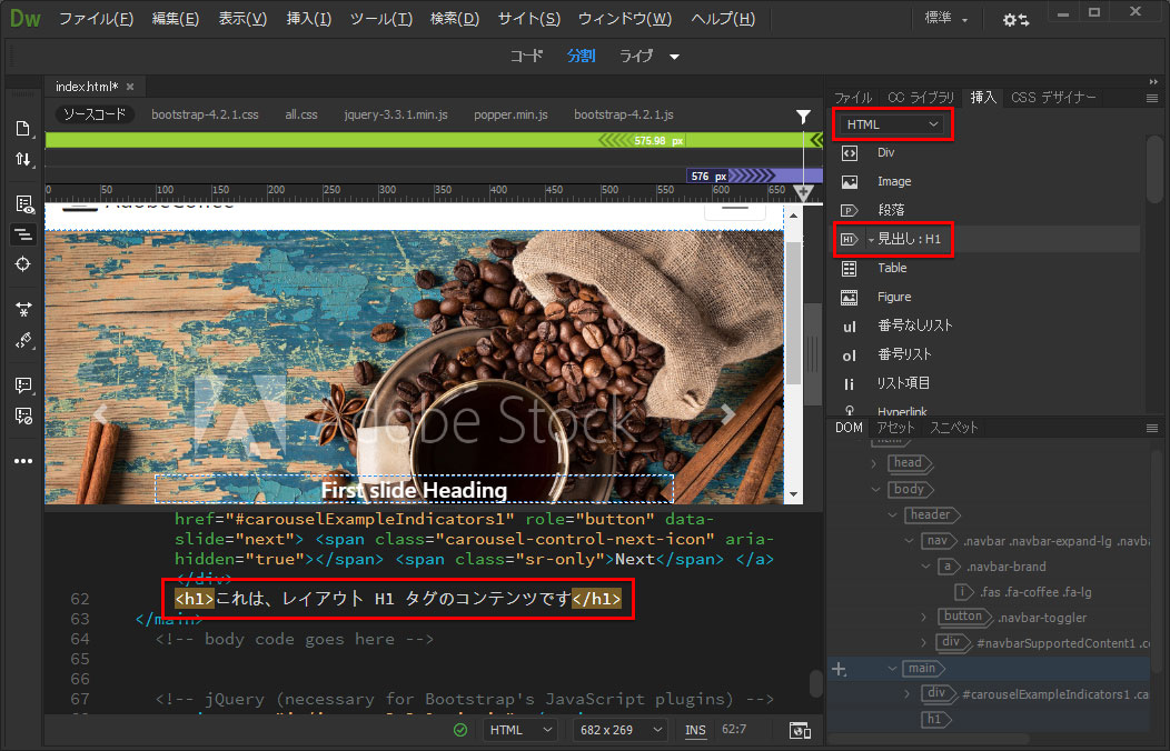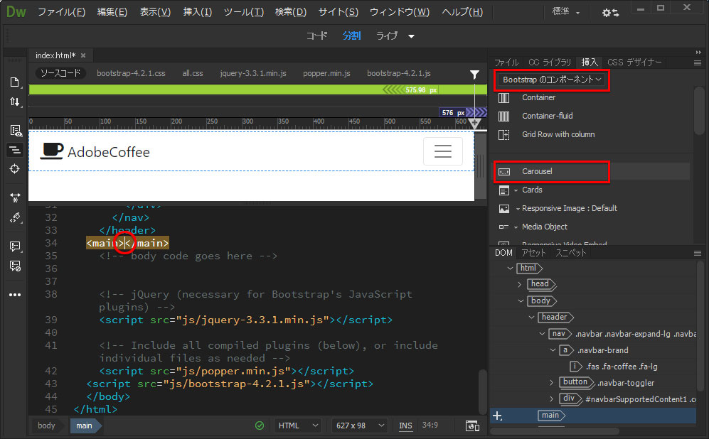 カルーセルは<main>の中に挿入したいので、コードビューで<main>の後ろにカーソルを置いた状態から始めます。