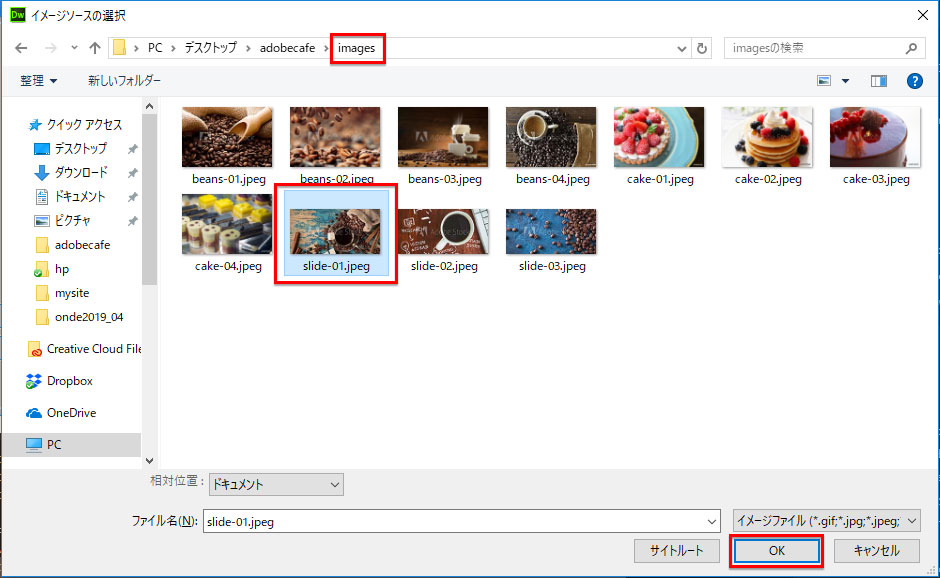 「images」フォルダ内にある「slide-01.jpg」を選択し、「OK」ボタンをクリックします。