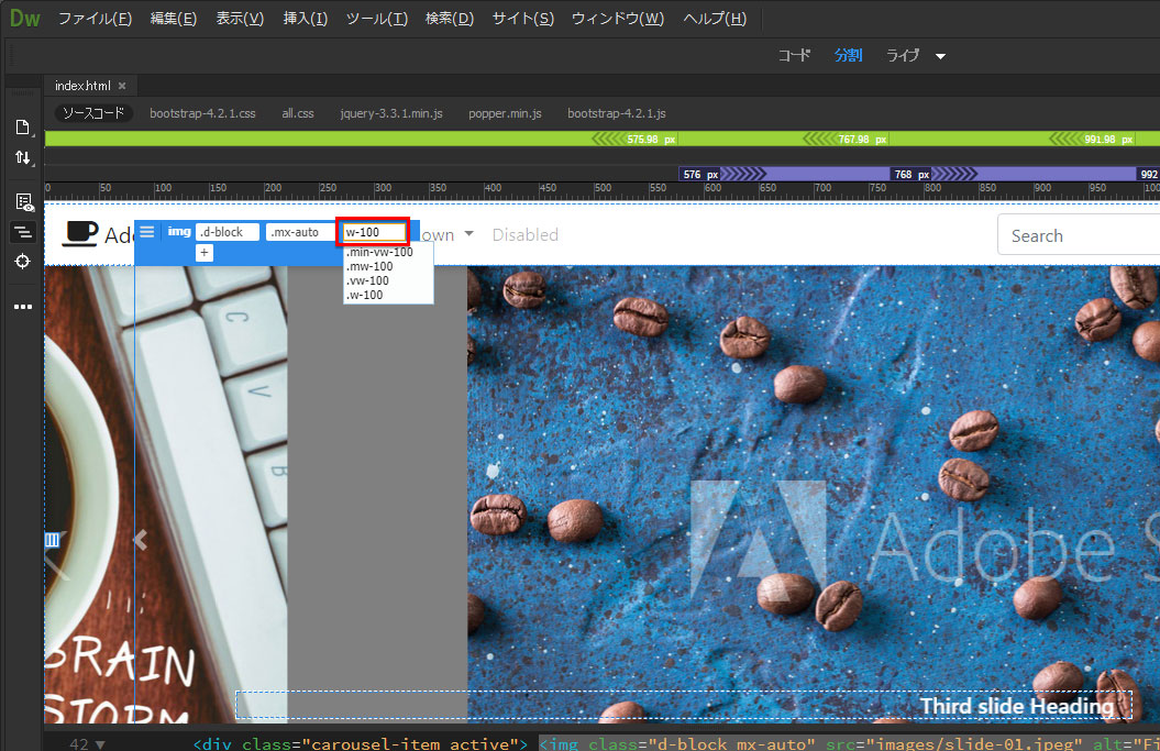 各画像を選択し、「+」ボタンから「w-100」クラスを追加します。