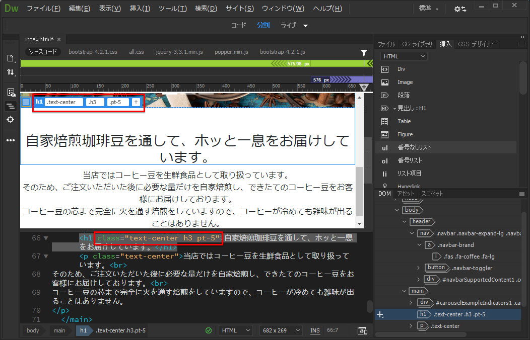 DOM パネルで<h1>を選択し、クラス「text-center」「h3」「pt-5」を追加します。