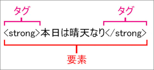 タグには開始タグと終了タグがあり、開始タグから終了タグまでをまとめて「要素」と呼びます。